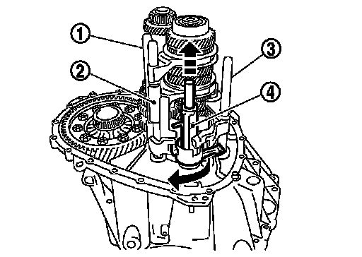 13.Pull up and remove input shaft assembly (1), mainshaft assembly (2), fork rod (3), and 1st-2nd fork rod (4) from clutch housing.