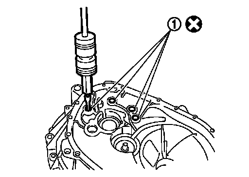 29.Remove mainshaft front bearing outer race (1) from clutch housing, using the puller (A) [SST: KV-381054S0 (J-34286)] and a spacer (B) [Commercial service tool].