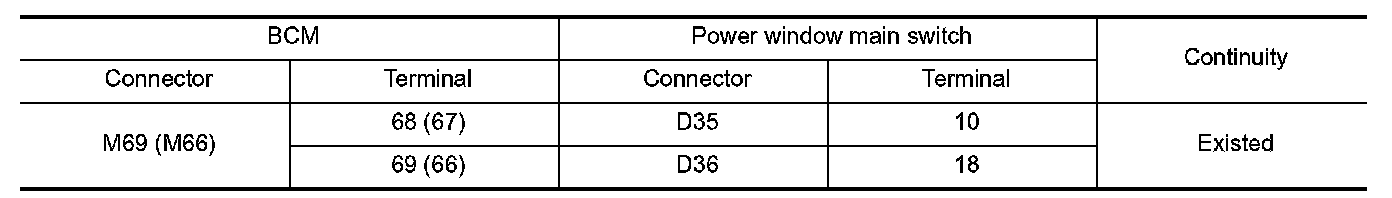 3.Check continuity between BCM harness connector and power window main switch harness connector.