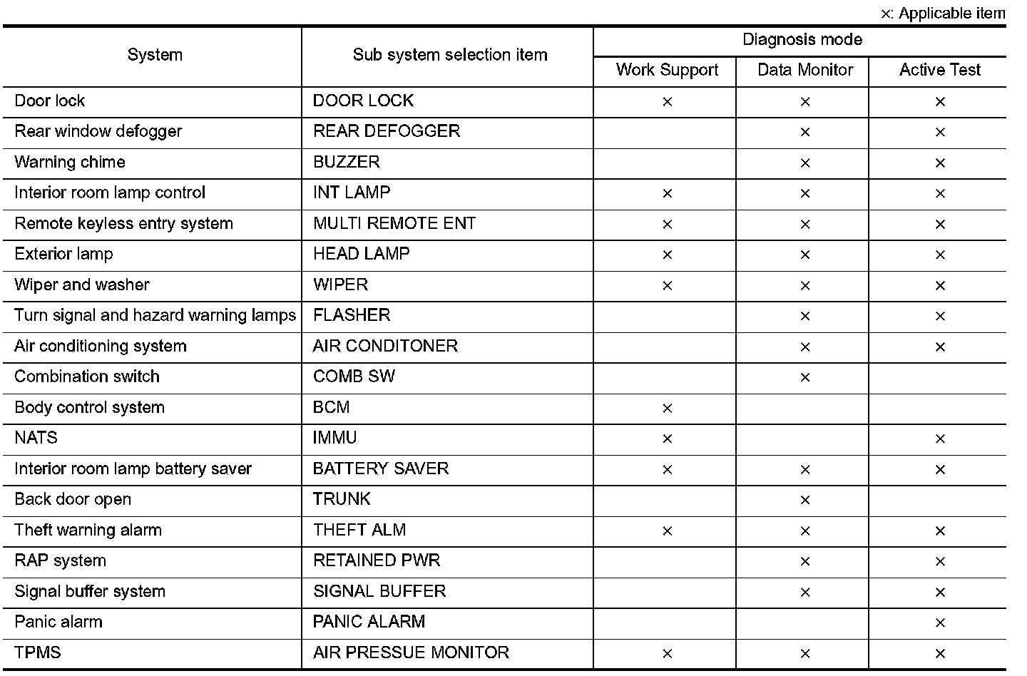 It can perform the diagnosis modes except the following for all sub system selection items.