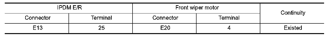 3.Check continuity between IPDM E/R harness connector and front wiper motor harness connector.