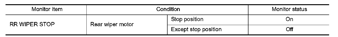 3.Check that "RR WIPER STOP" changes to "On" and "Off" linked with the wiper operation.