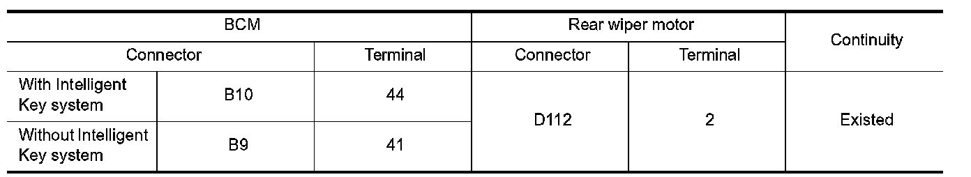 3.Check continuity between BCM harness connector and rear wiper motor harness connector.