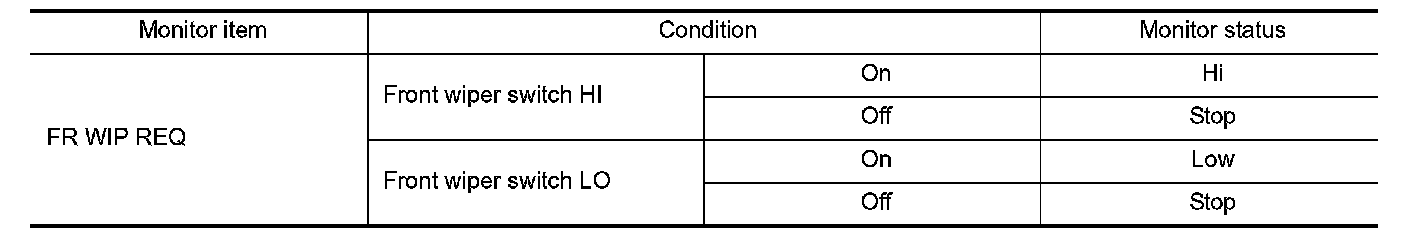 3.With operating the front wiper switch, check the status of "FR WIP REQ".
