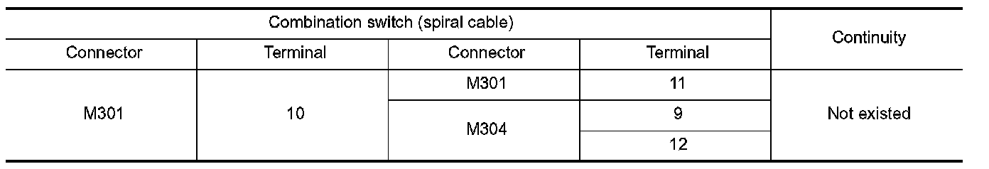 Check continuity between combination switch (spiral cable) terminals.