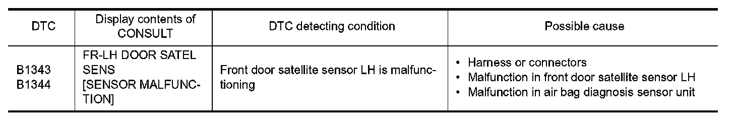 1.Replace front door satellite sensor LH. Refer to "Removal and Installation" Removal And Installation.