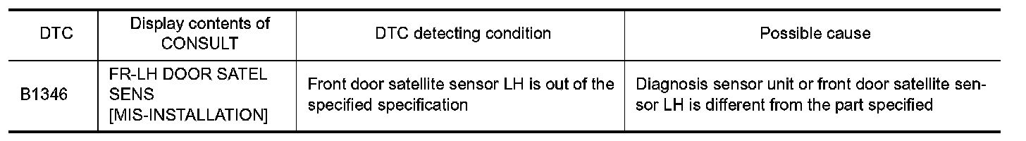 1.Replace front door satellite sensor LH. Refer to "Removal and Installation" Removal And Installation.