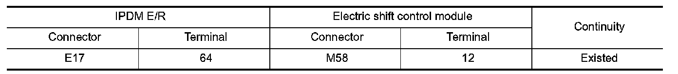 2.Check continuity between IPDM E/R harness connector and electric shift control module harness connector.