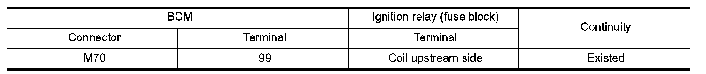 3.Check continuity between BCM harness connector and ignition relay (fuse block) harness connector.