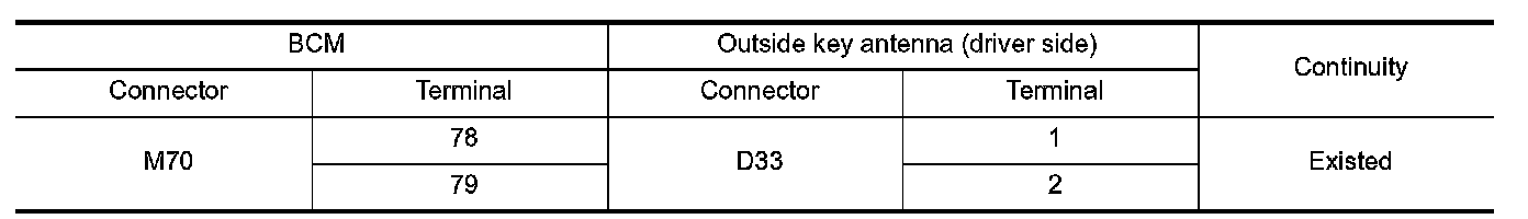 2.Check continuity between BCM harness connector and outside key antenna (driver side) harness connector.