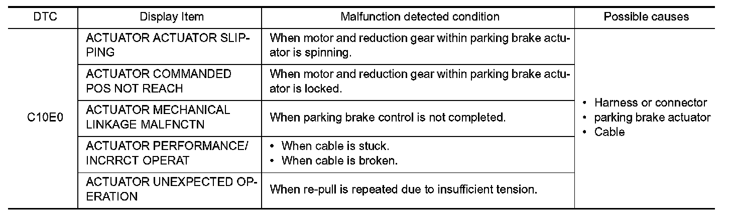 YES ("C11E0")-Replace parking brake actuator. Refer to "Removal and Installation" Removal And Installation.