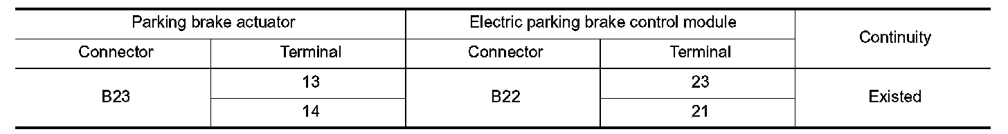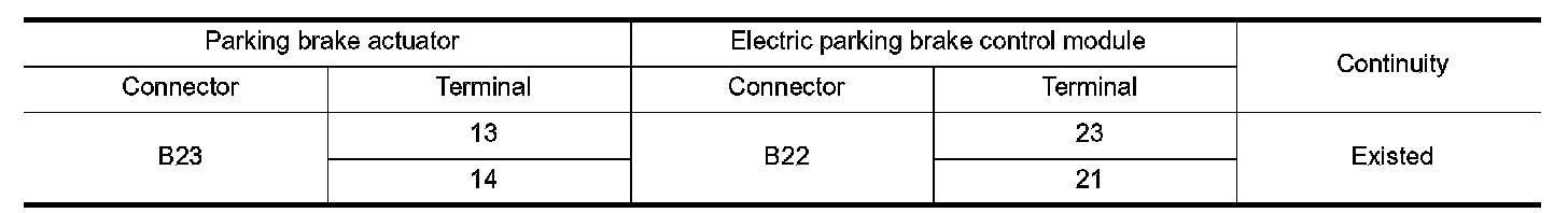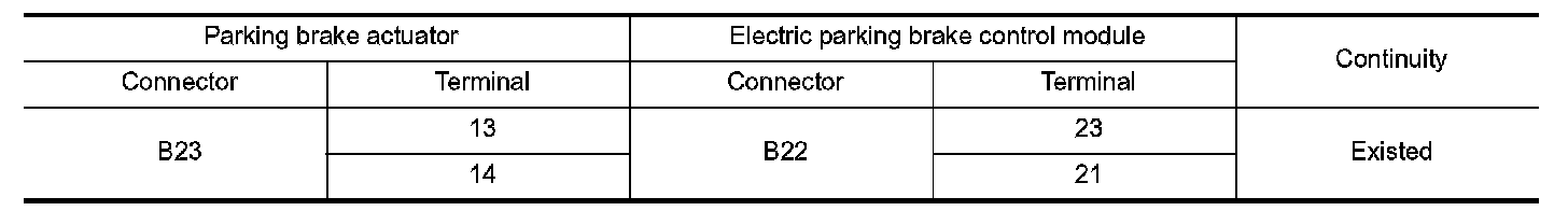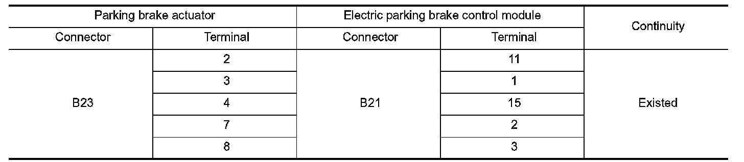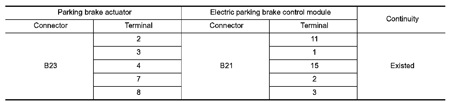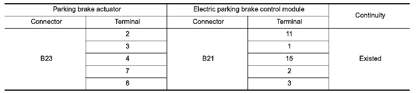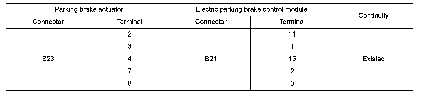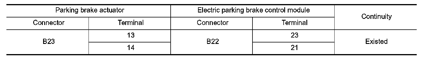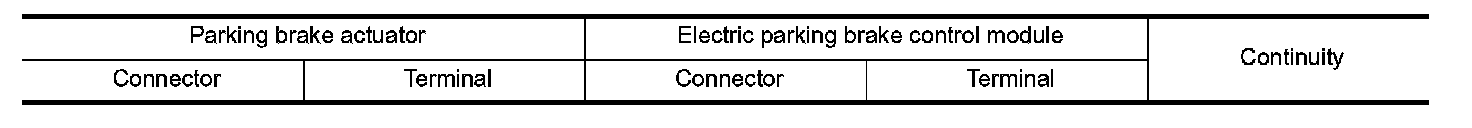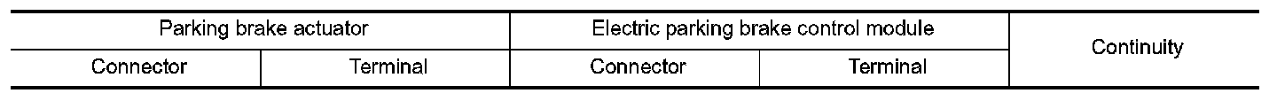 1.Check the continuity between parking brake actuator and electric parking brake control module harness connector.