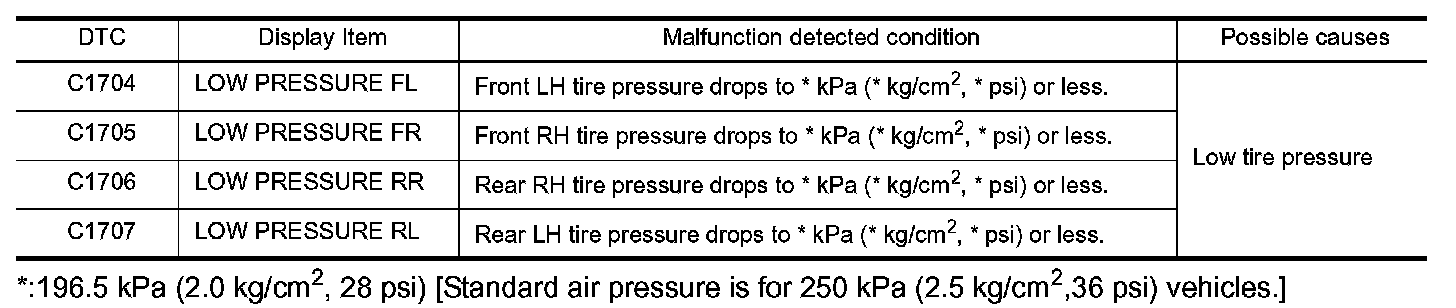 *:196.5 kPa (2.0 kg/cm, 28 psi) [Standard air pressure is for 250 kPa (2.5 kg/cm,36 psi) vehicles.]