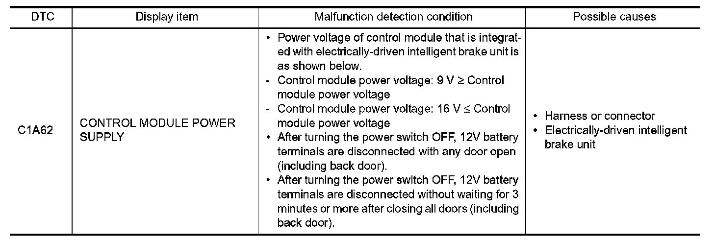 NO- INSPECTION END [DTC "C1A62" is detected when12V battery terminals are disconnected after turning the power switch OFF with any door open (including back door) or without waiting 3 minutes after closing all doors (including back door).]