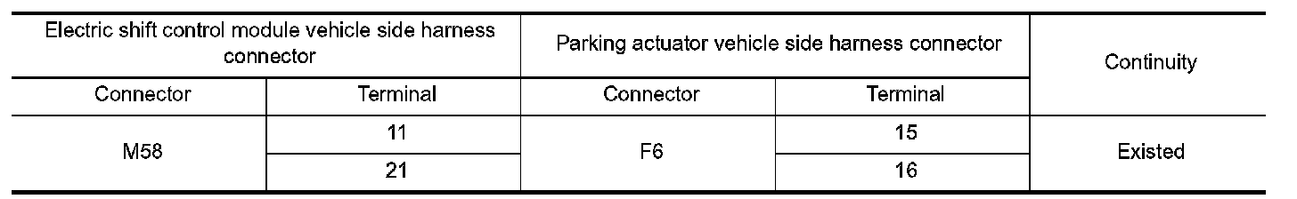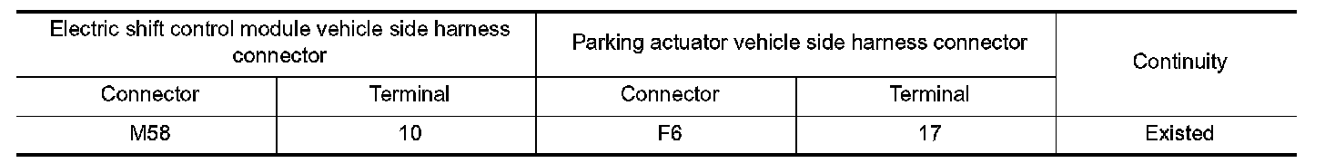 3.Check the continuity between electric shift control module vehicle side harness connector terminals and parking actuator vehicle side harness connector terminals.