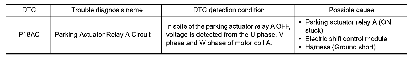 Check the parking actuator relay A. Refer to "Component Inspection (Parking Actuator Relay A)" .