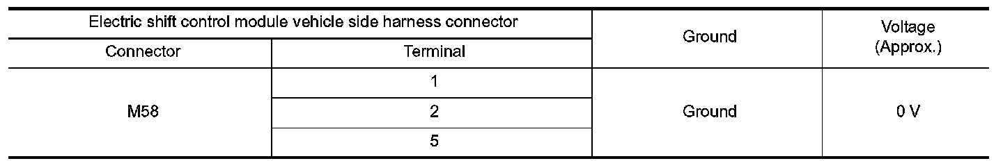 Check the voltage between electric shift control module vehicle side harness connector terminals and ground.