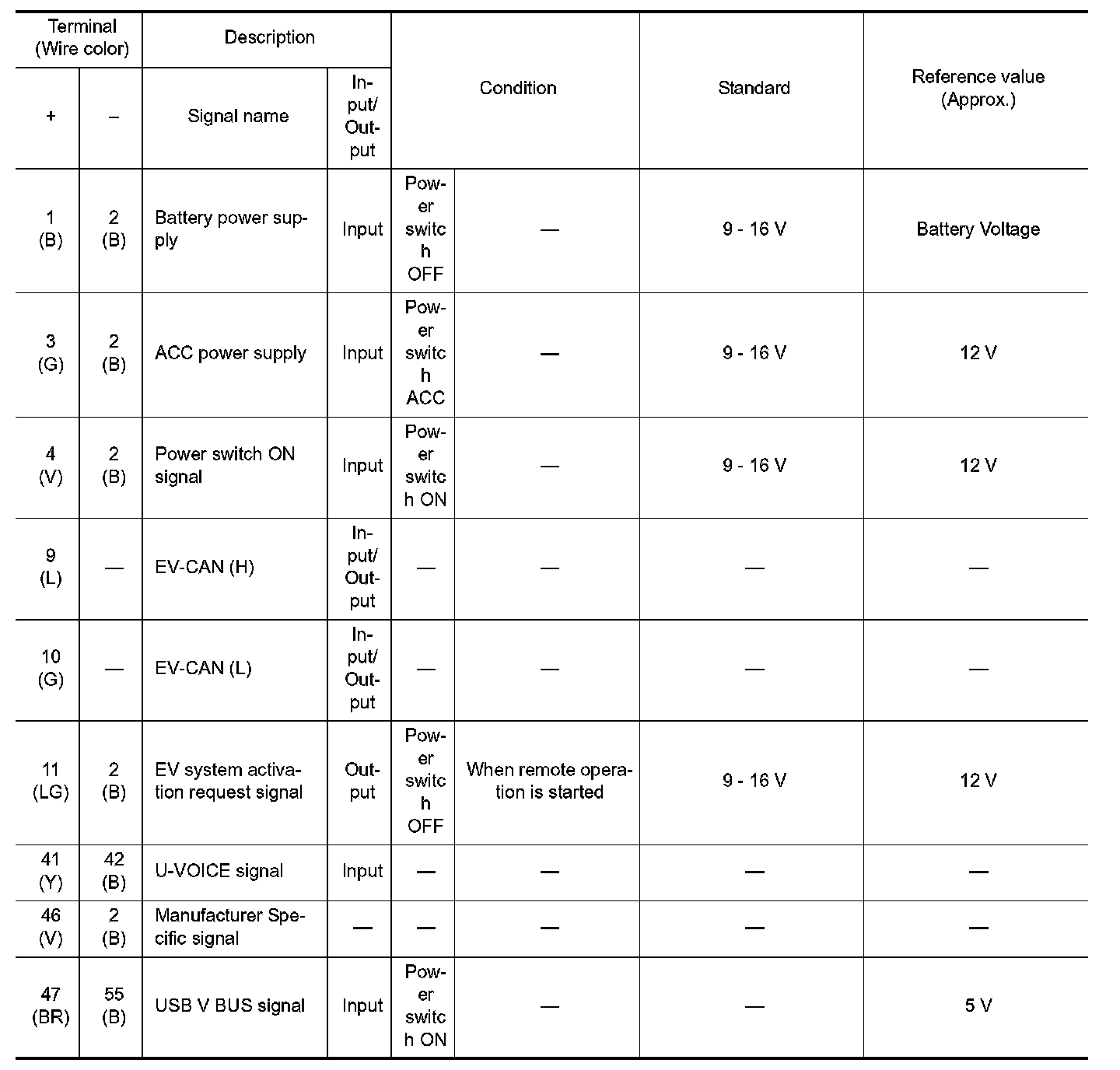 Pinout Values and Diagnostic Parameters