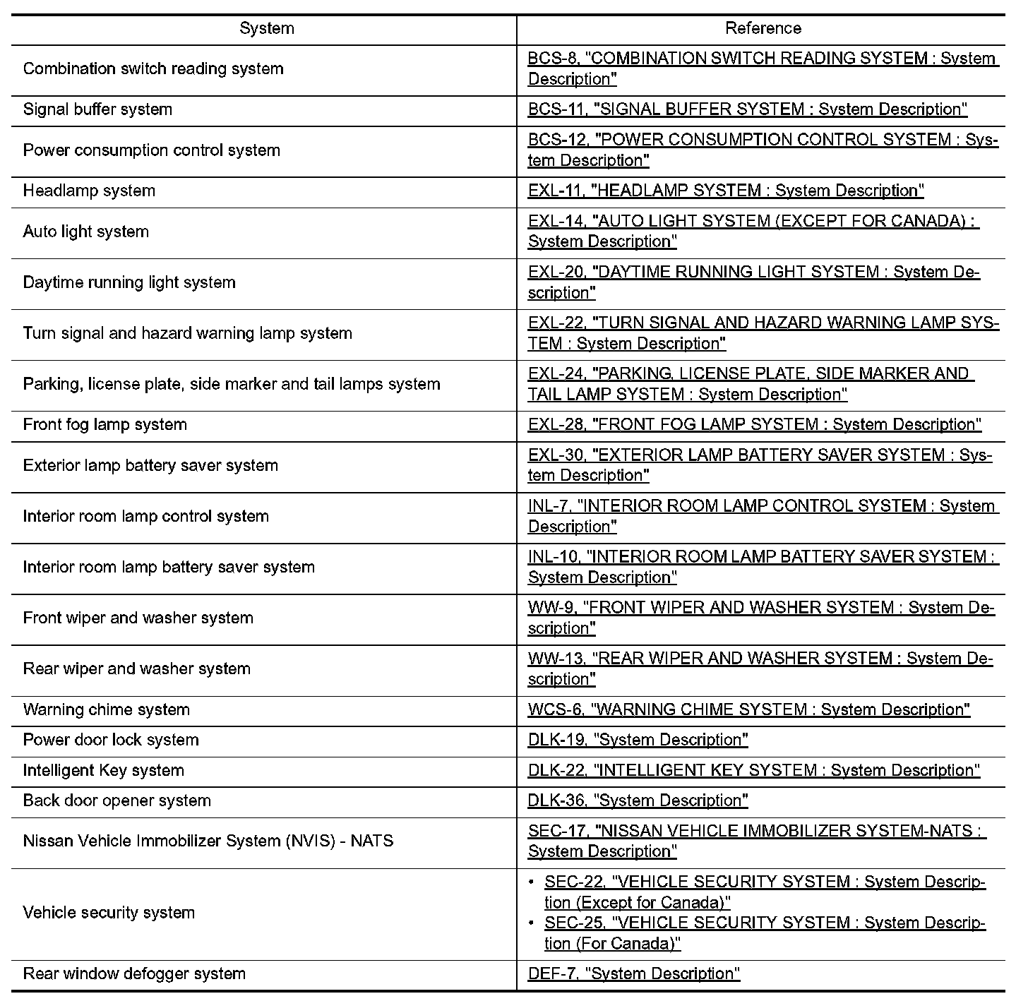 - BCM has combination switch reading function for reading the operation status of combination switches (light, turn signal, wiper and washer) in addition to a function for controlling the operation of various electrical components. It also has the signal transmission function as the passed point of signal and the power saving control function that reduces the power consumption with the power switch OFF.