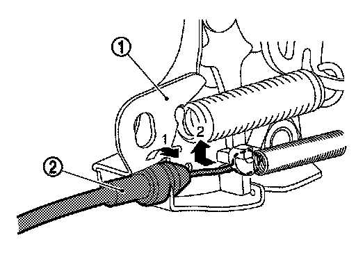 3.Disconnect hood lock control cable (2) from hood lock assembly (1).