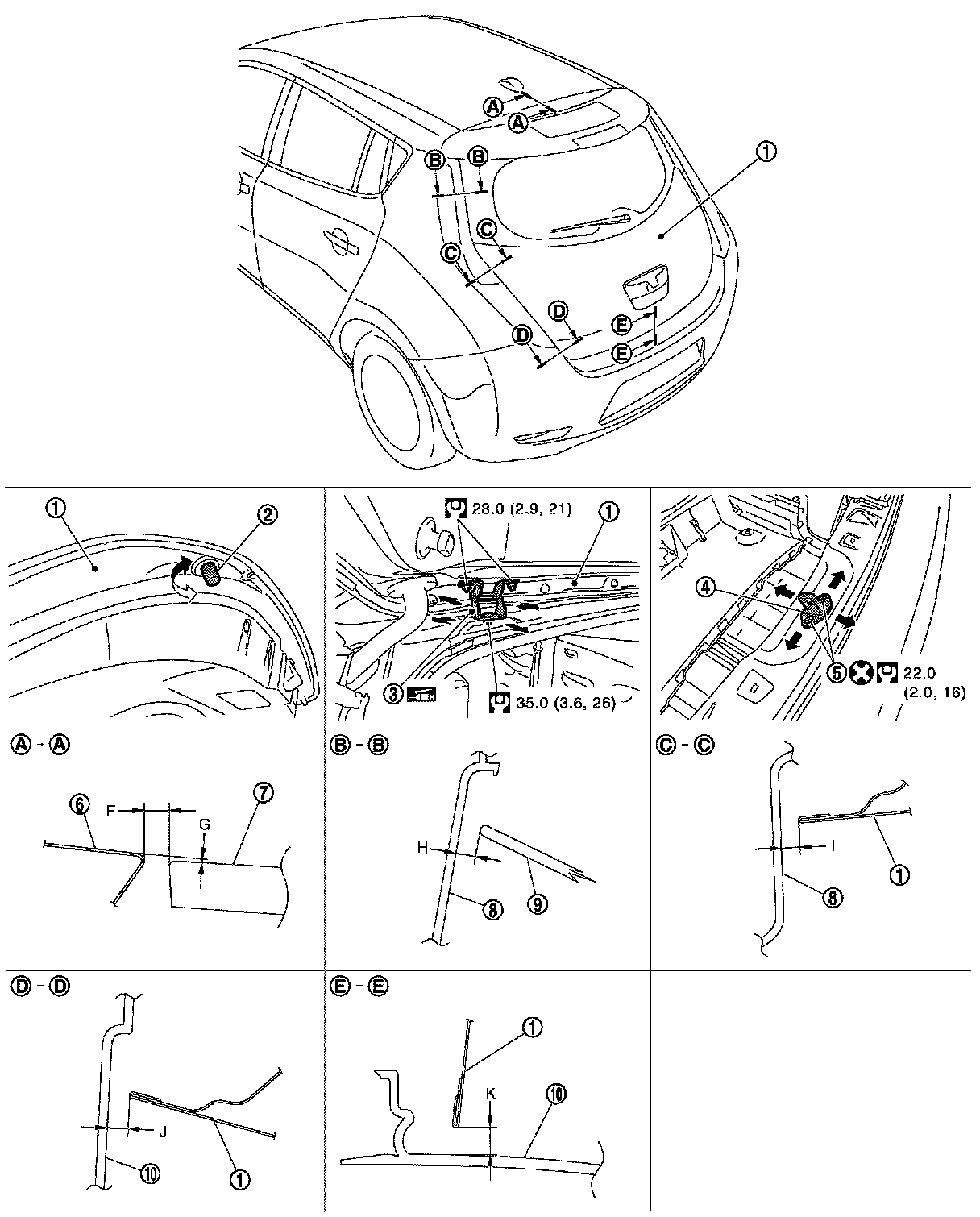 3.Adjust back door using back door striker and back door hinge to the specified value, as shown in the following table.