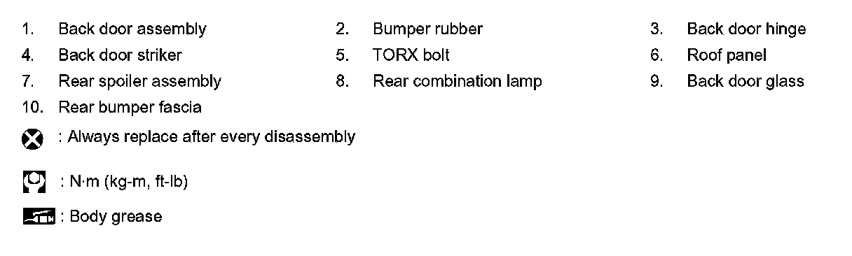 4.After adjustment tighten back door striker mounting bolts and back door hinge mounting nuts (back door side) to the specified torque.