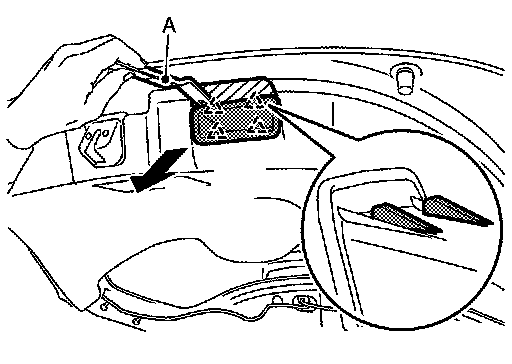 b.Disengage back door pull handle fixing pawls with a remover tool (A), and then remove back door pull handle.
