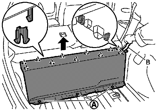c.Disengage luggage floor upper finisher fixing pawls with a remover tool (B), and then remove luggage floor upper finisher.