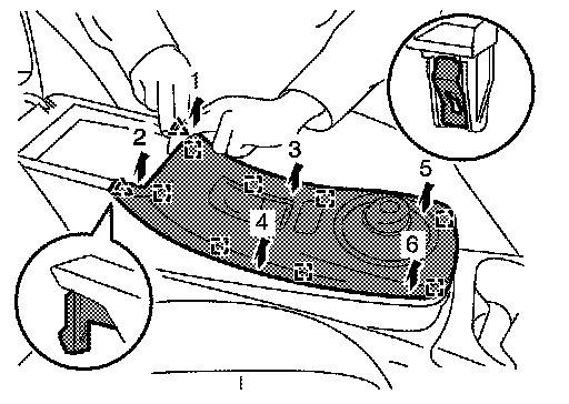 1.Lift up console finisher assembly back side, and then disengage the pawls and metal clips according to the numerical order 1