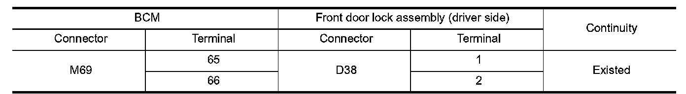 2.Check continuity between BCM harness connector and front door lock assembly (driver side) harness connector.