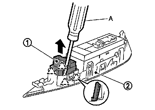 2.Remove door mirror remote control switch (1) from power window main switch finisher (2) using remover tool (A).