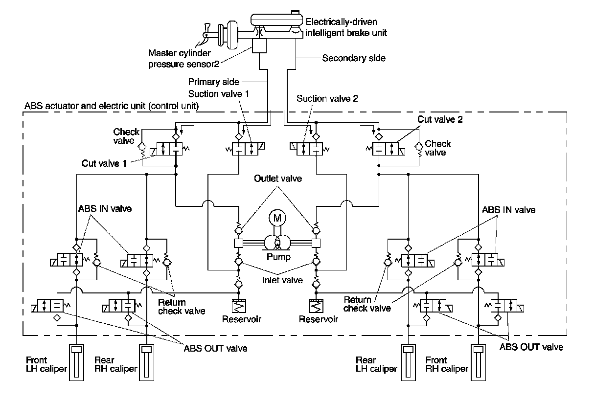- When the cut valve 2 and the ABS IN valve opens, brake fluid is supplied to the rear LH brake caliper from the electrically-driven intelligent brake unit through the ABS IN valve. Brake fluid does not flow into the reservoir because the ABS OUT valve is closed.