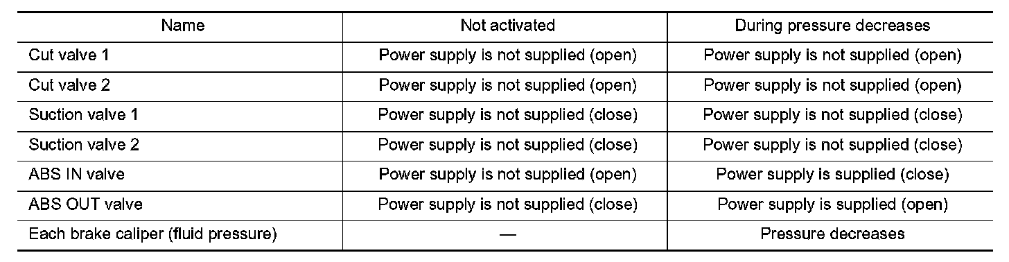 - When the cut valve 1 and the ABS IN valve opens, brake fluid is supplied to the rear RH brake caliper from the electrically-driven intelligent brake unit through the ABS IN valve. Brake fluid does not flow into the reservoir because the ABS OUT valve is closed.