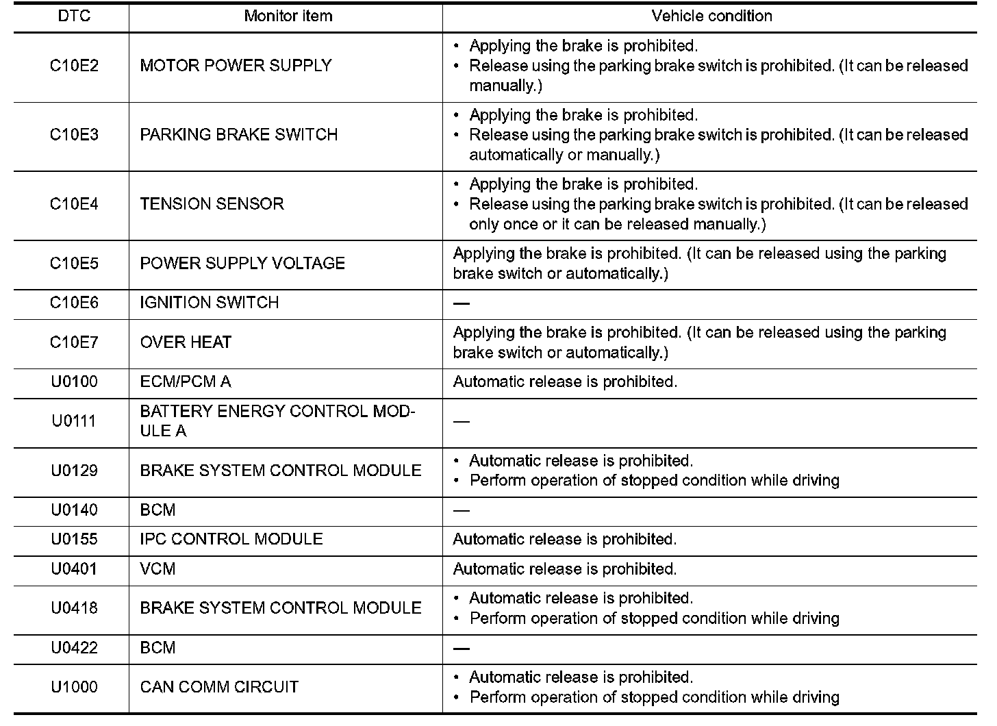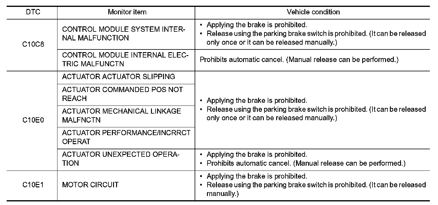 - When parking brake switch is pulled/pushed during system malfunction, electric parking brake indicator lamp blinks and master warning lamp (red) turns ON when electric parking brake cannot be operated. It restricts braking and release operations of electric parking brake.