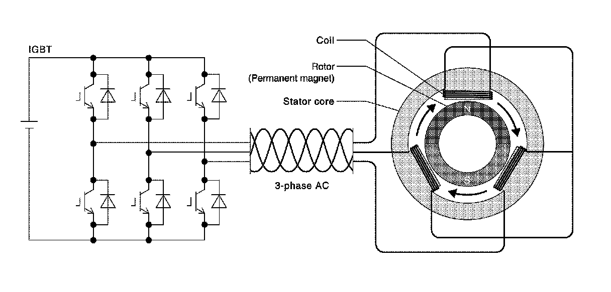 - When 3-phase AC current is applied to the stator coil, a rotating magnetic field is generated. This rotating magnetic field pulls on the permanent magnet inside the rotor core, generating rotational torque that is synchronized with the rotating magnetic field. The generated torque is approximately proportional to the current, and the rotating speed depends on the frequency of the 3-phase current.