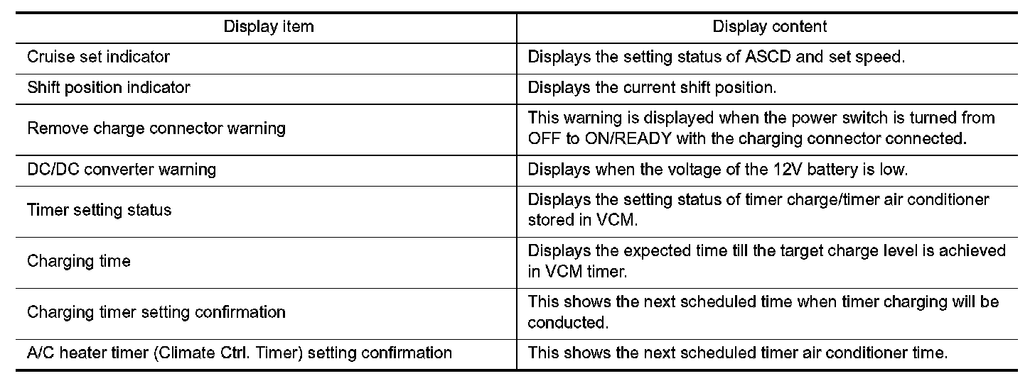 Information necessary to control the information display is transmitted from each relevant control unit and entered into the combination meter. Based on this information, warning or other information appears on the information display. VCM displays the following items.