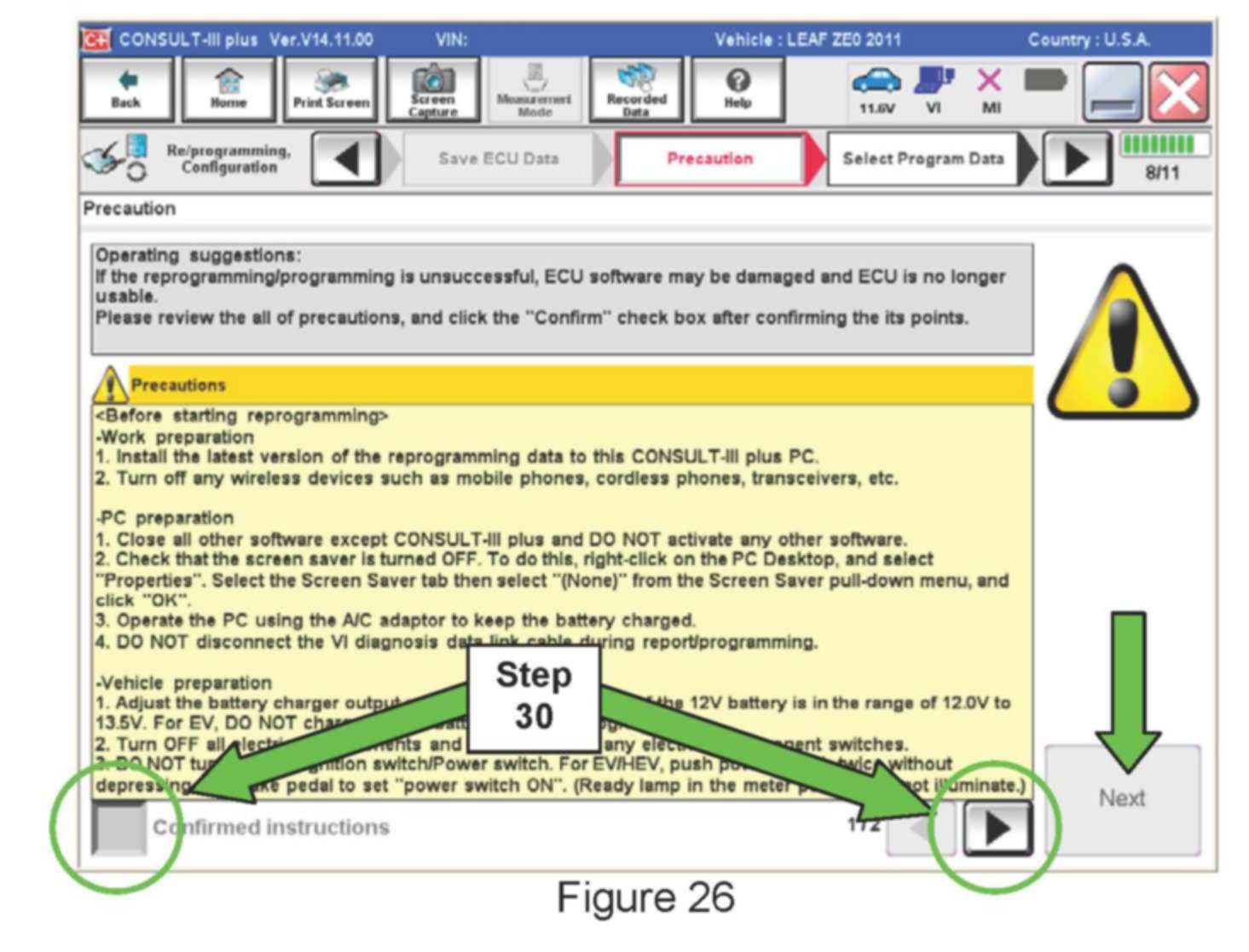 30. Read the precautions at the beginning of this bulletin and then select page 2 (page 2 not shown) with arrow. After reading page 2 select Confirmed instructions and then select Next.