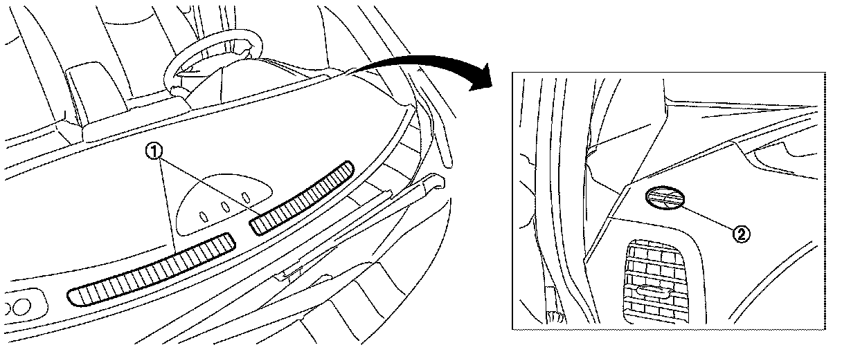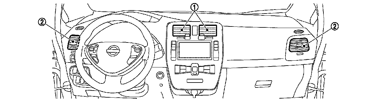 A grille with shutter is installed on the center ventilators (1) and side ventilators (2). The air direction can be adjusted by opening and closing the grille.