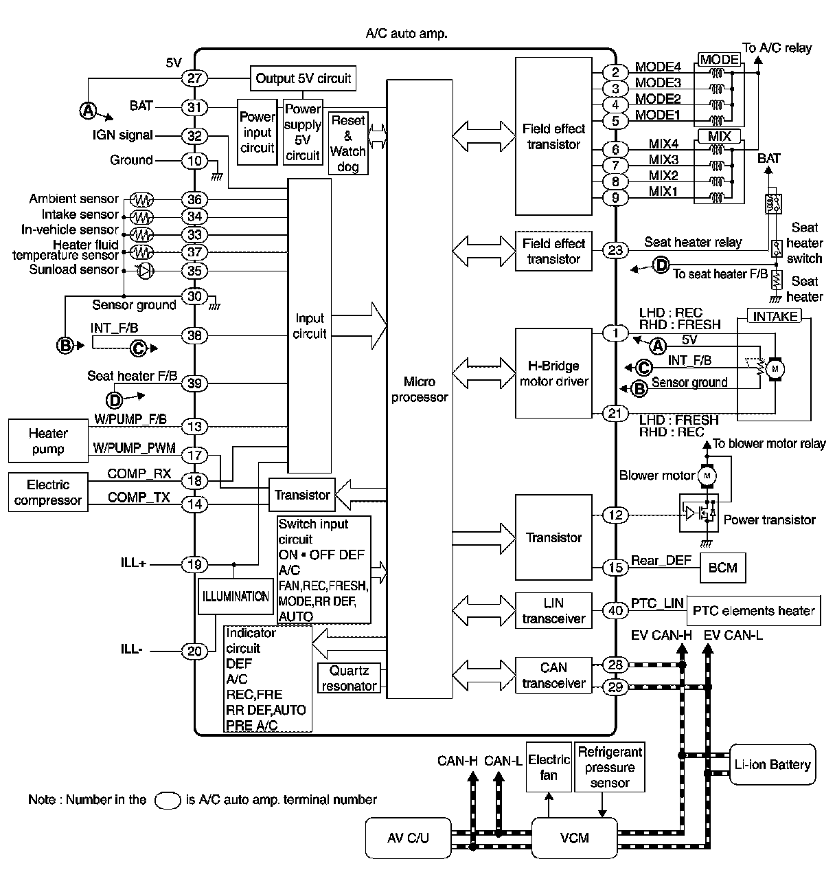 - The A/C auto amp. sends various display information to VCM via EV CAN communication.