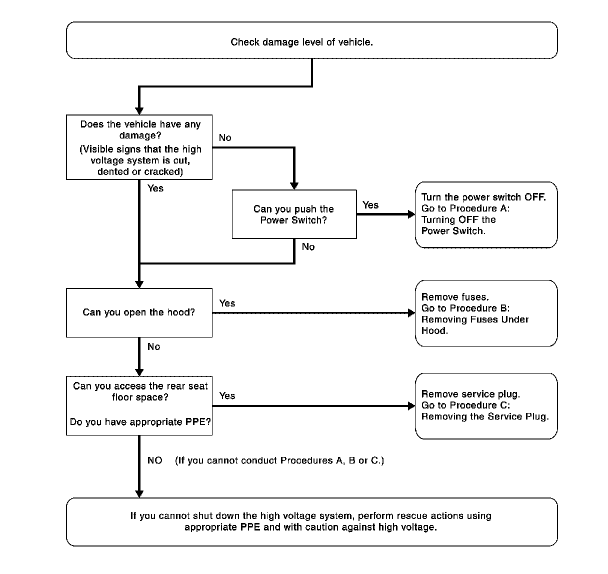 Shut down the high voltage system according to vehicle damage level. Any of the following procedures can shut down the high voltage system. The first response operation should be done after shutting down the high voltage system.