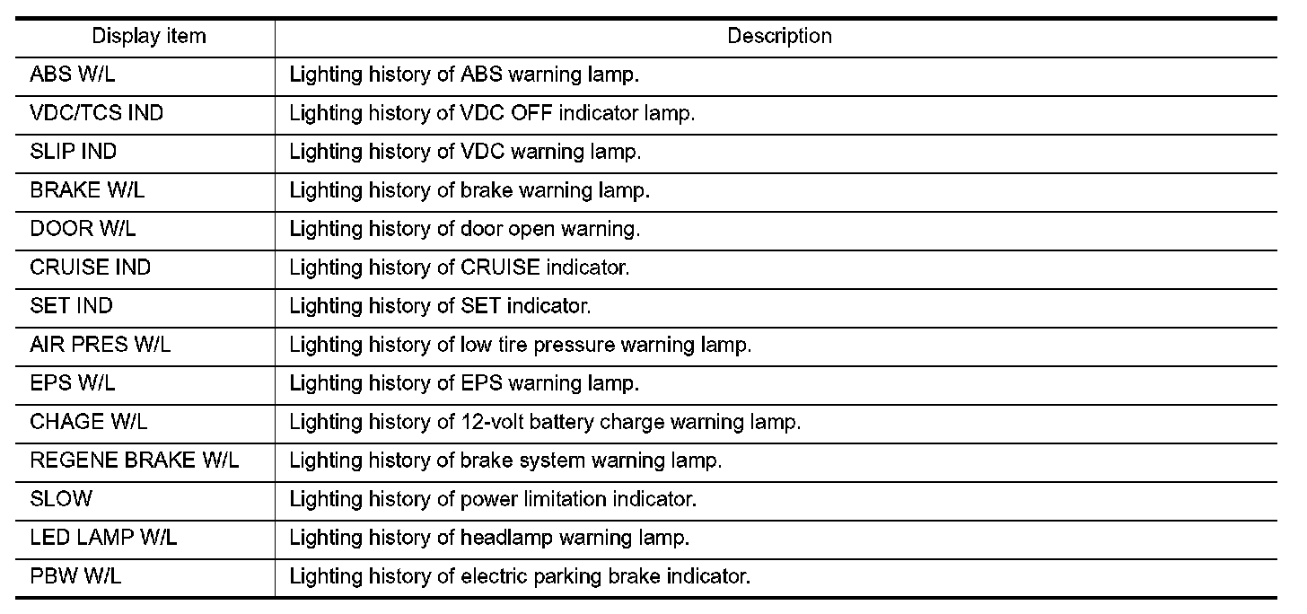 - "W/L ON HISTORY" indicates the "TIME" when the warning/indicator lamp is turned on.
