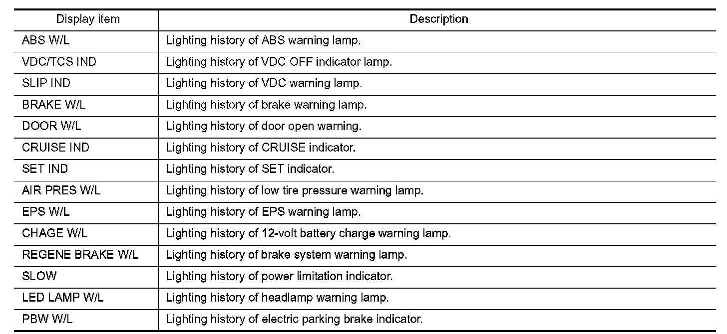 - "W/L ON HISTORY" indicates the "TIME" when the warning/indicator lamp is turned on.