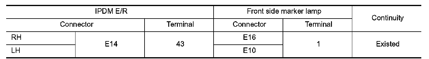 3.Check continuity between IPDM E/R harness connector and front side marker lamp harness connector.