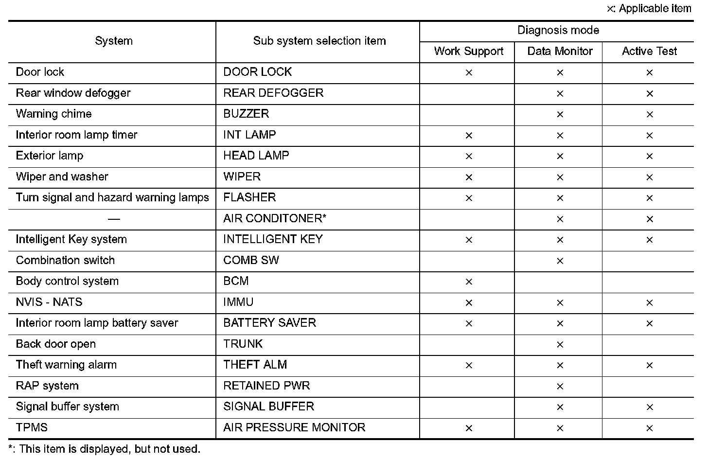 It can perform the diagnosis modes except the following for all sub system selection items.