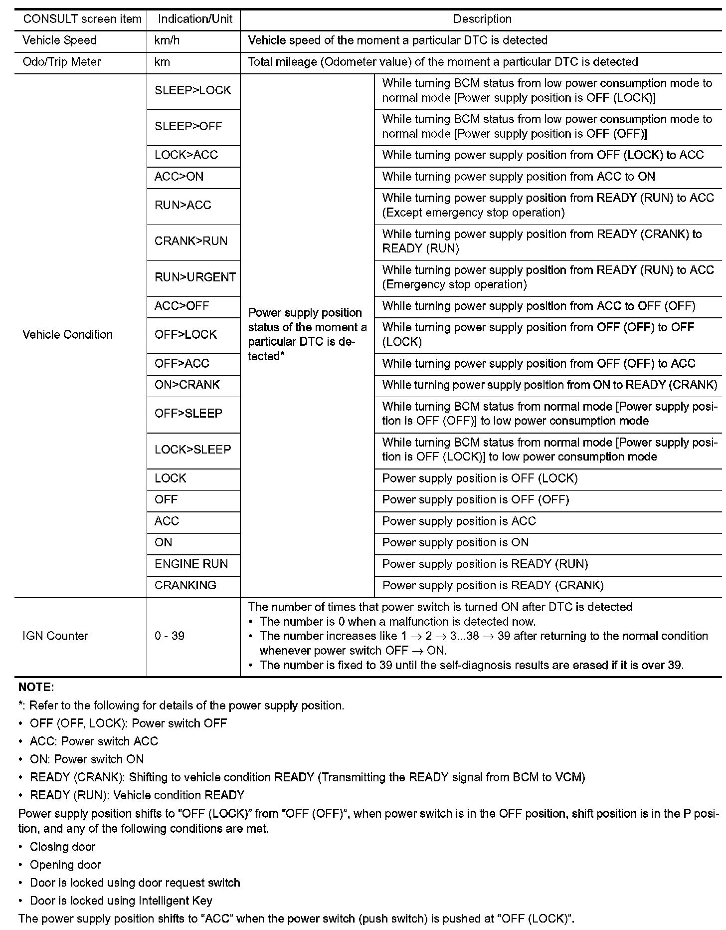 The BCM records the following vehicle condition at the time a particular DTC is detected, and displays on