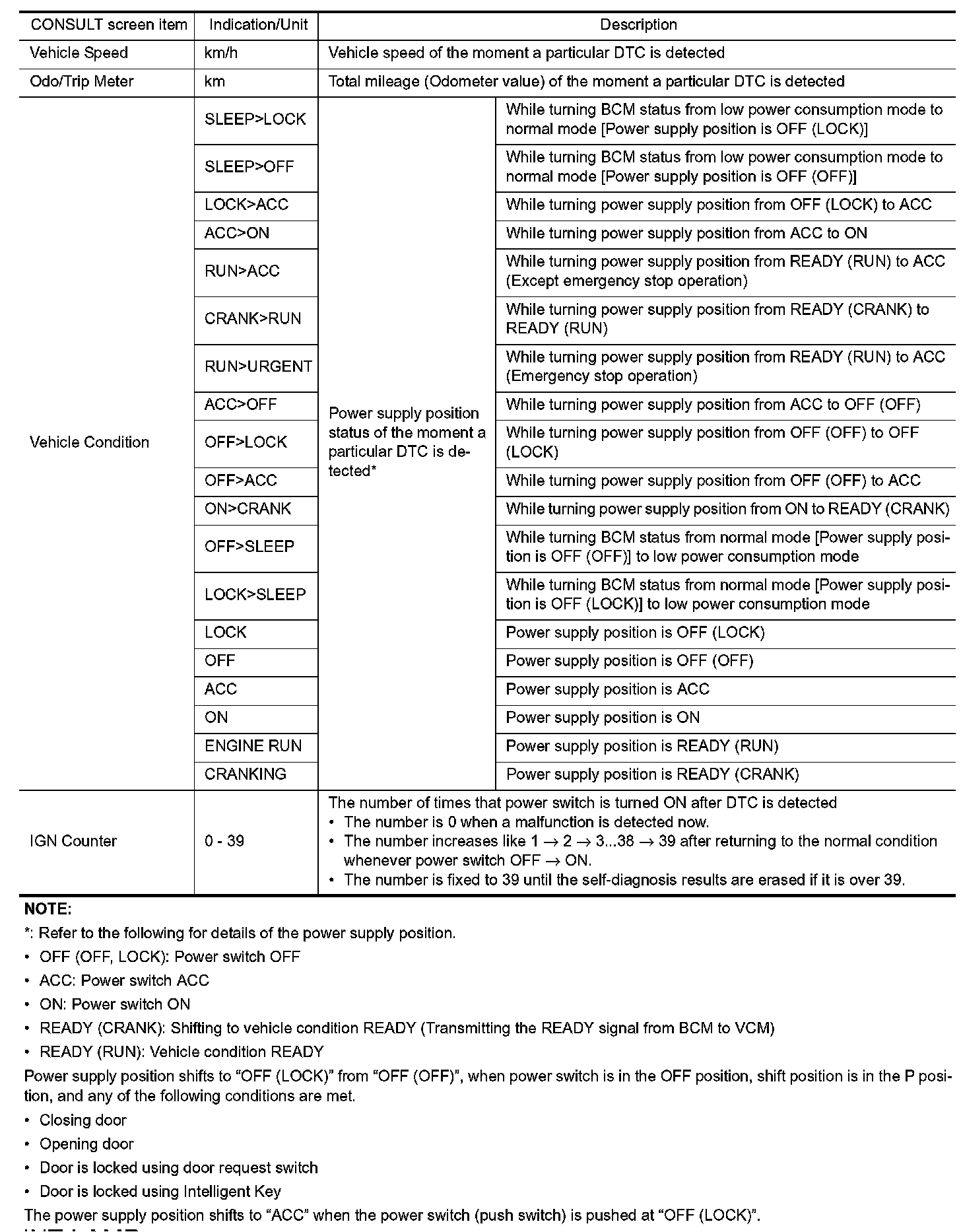 The BCM records the following vehicle condition at the time a particular DTC is detected, and displays on