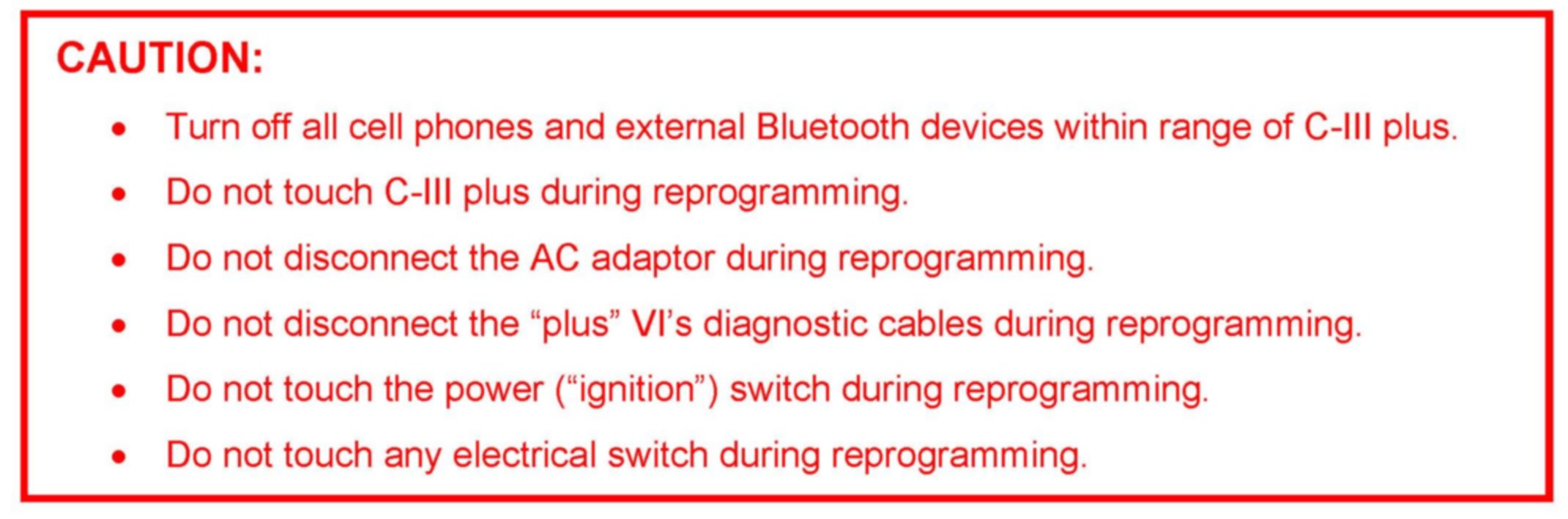 Do not disconnect plus VI or shut down Consult III plus if reprogramming does not complete.