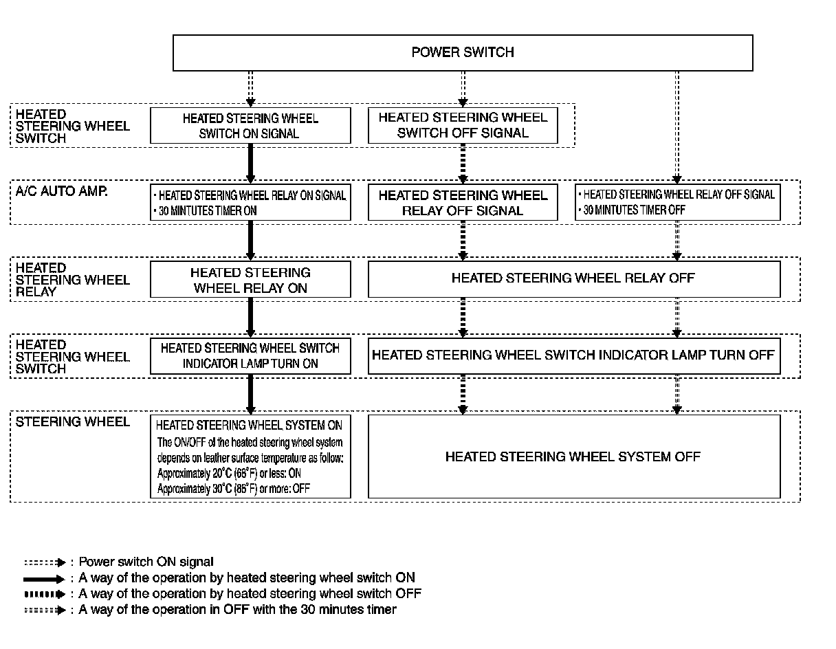 - The A/C auto amp. has a timer. After the heated steering wheel switch is turned ON, when operating time becomes more than the specified time (30 minutes), the A/C auto amp. tunes OFF the heated steering wheel relay to stop heating.