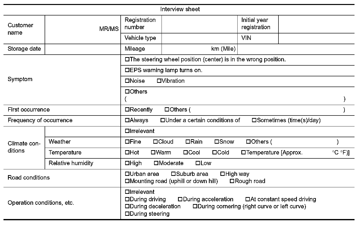 - In general, customers have their own criteria for a problem. Therefore, it is important to understand the symptom and status well enough by asking the customer about his/her concerns carefully. To systemize all the information for the diagnosis, prepare the interview sheet referring to the interview points.