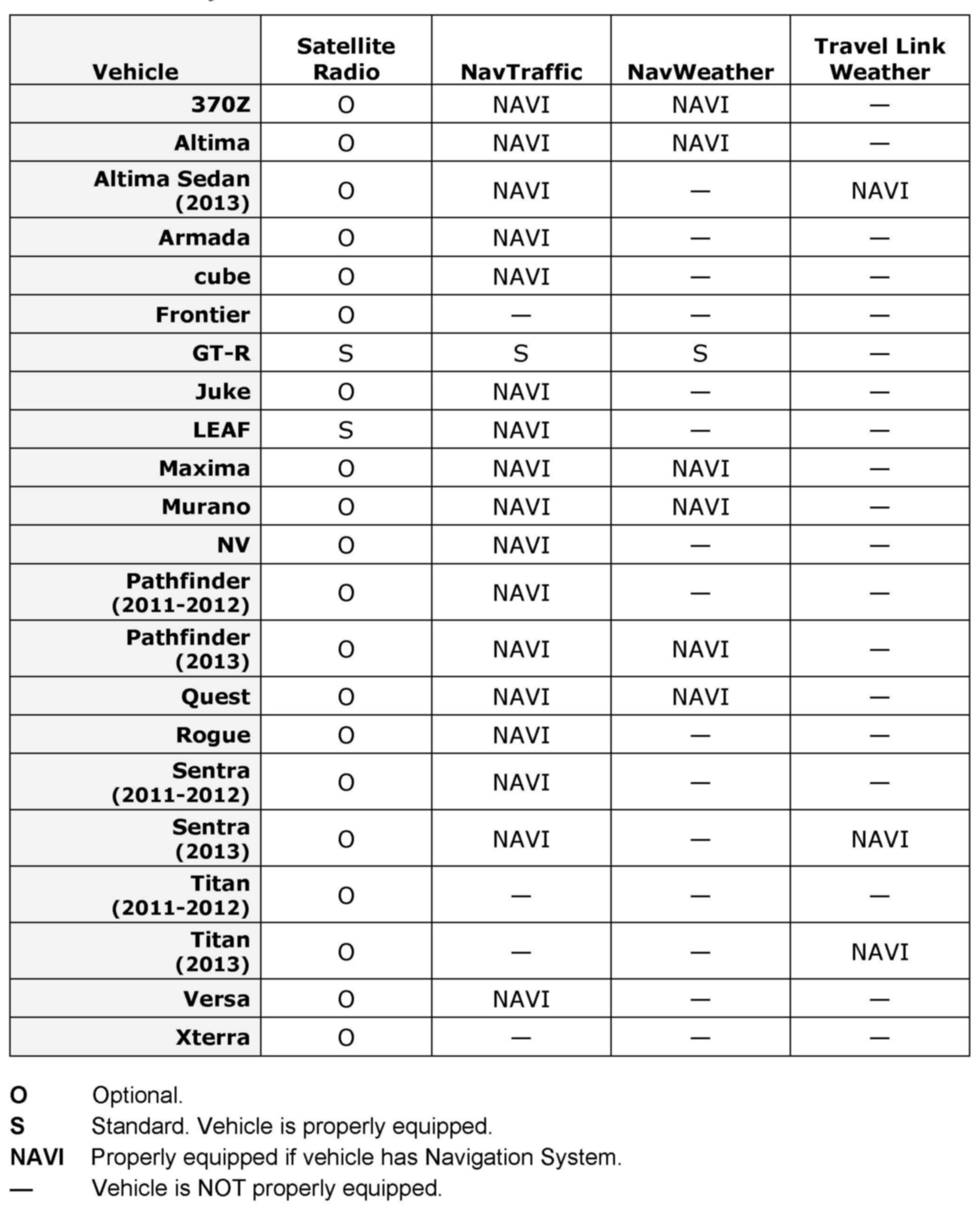 Before attempting to activate a subscription for satellite radio, NavTraffic, NavWeather, or Travel Link Weather, review the service availability chart below to confirm the vehicle is properly equipped for the service.